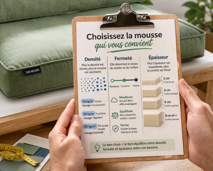 Trois critères doivent guider votre choix : la densité, la fermeté et l’usage. Ensemble, ils déterminent la qualité globale de votre coussin. Une mousse bien choisie permet non seulement d’améliorer le confort, mais aussi d’optimiser la tenue dans le temps et d’assurer un excellent rapport qualité.